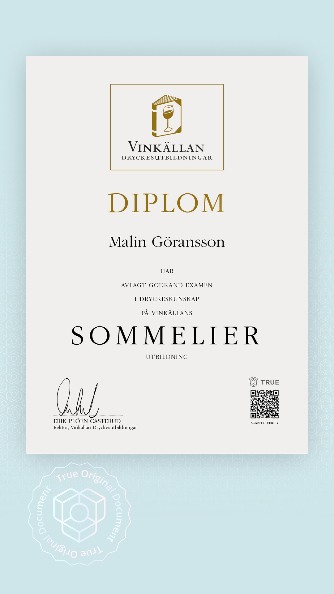 Alla TRUE -document är säkrade med blockchain-teknologi och kan verifieras som äkta. Klicka på verifieringsknappen bredvid dokumentet eller skanna QR-koden med din smartphones kamera. Ingen app krävs - dokumentets äkthet verifieras omedelbart.