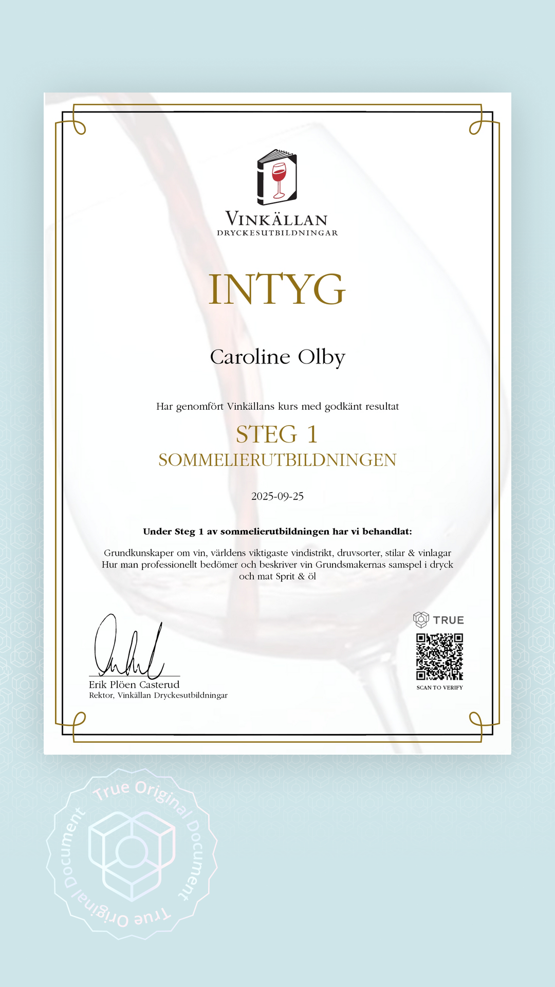 Alla TRUE -document är säkrade med blockchain-teknologi och kan verifieras som äkta. Klicka på verifieringsknappen bredvid dokumentet eller skanna QR-koden med din smartphones kamera. Ingen app krävs - dokumentets äkthet verifieras omedelbart.